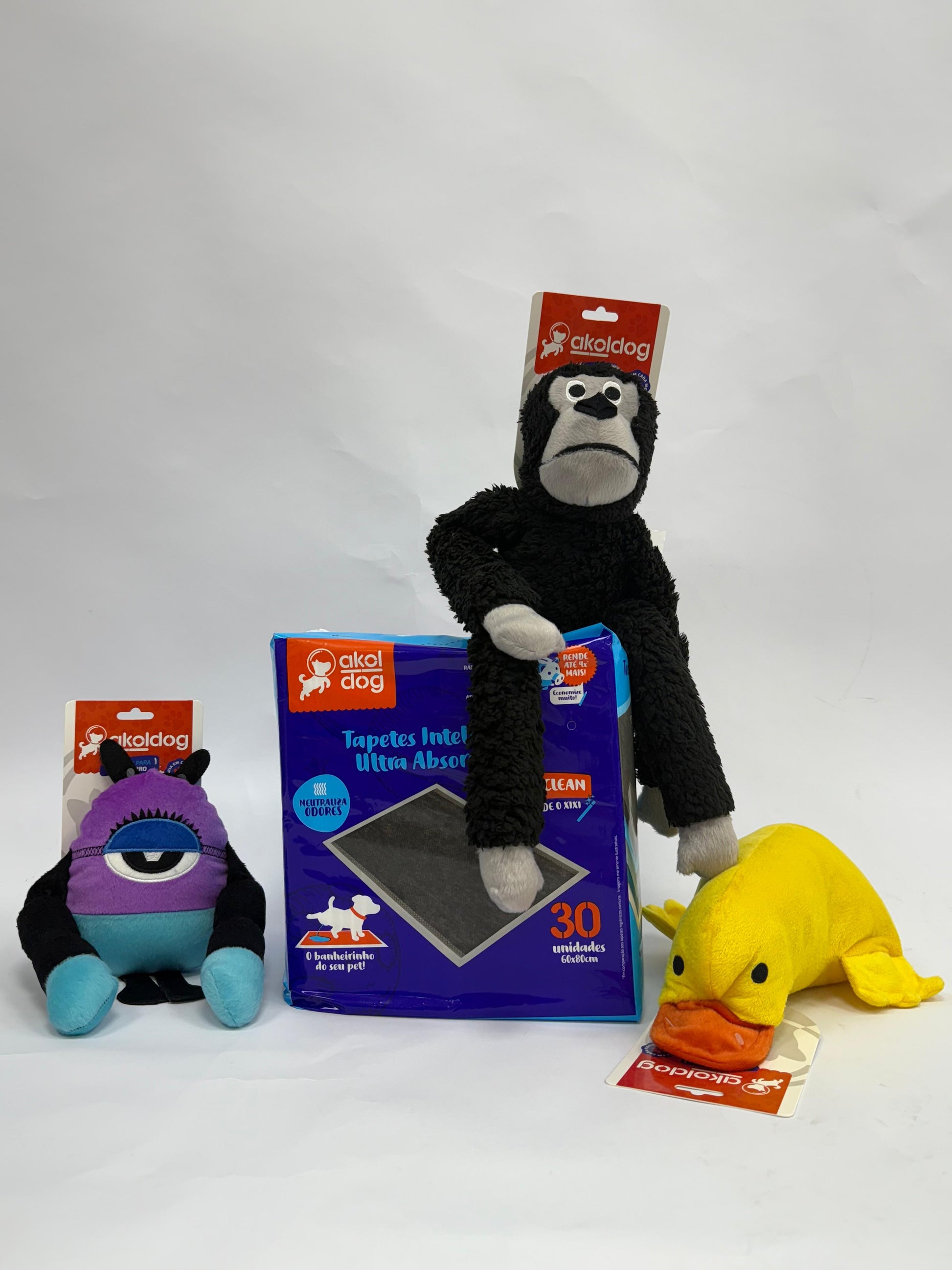 Acompanha 1 brinquedo à sua escolha: macaco, monstro ou pato